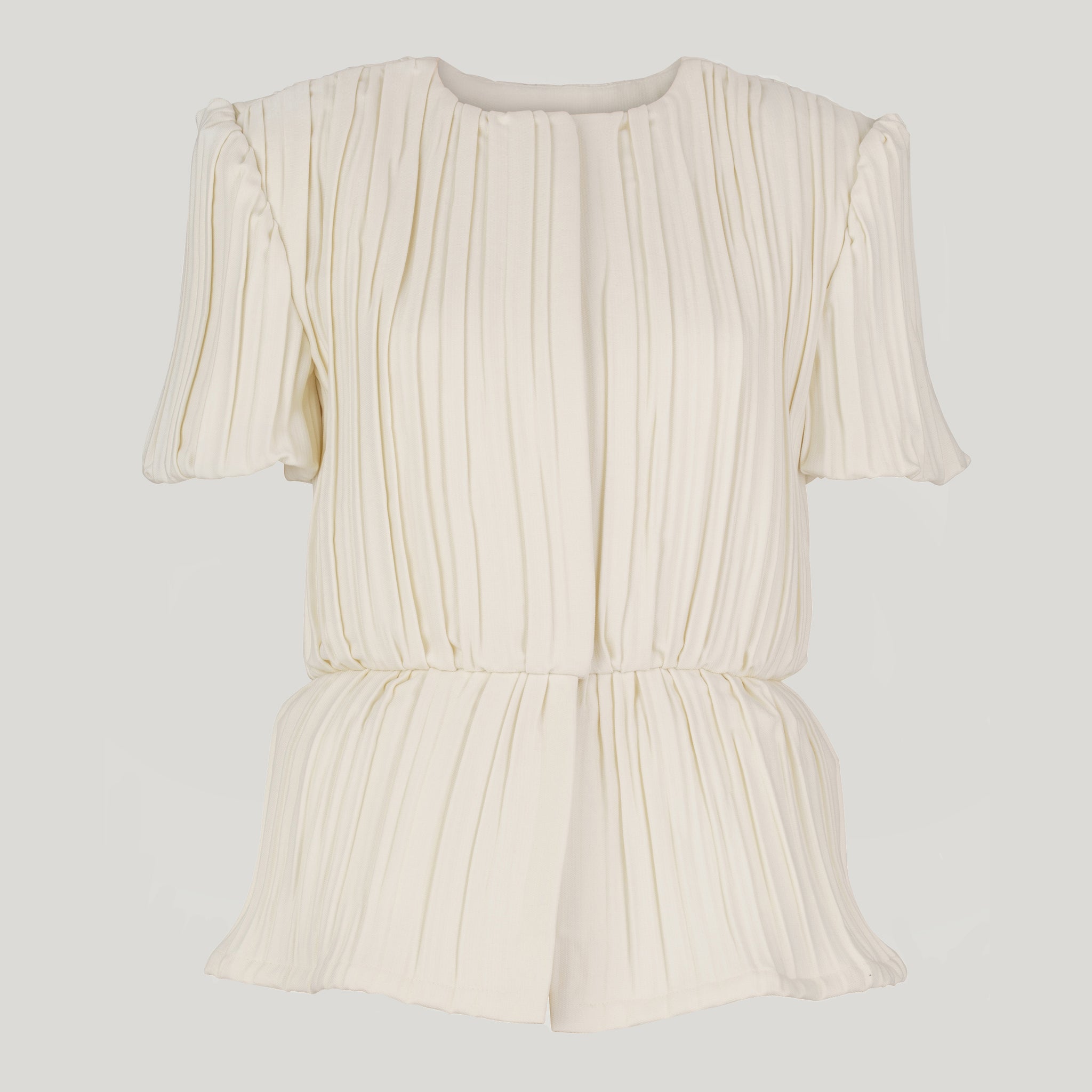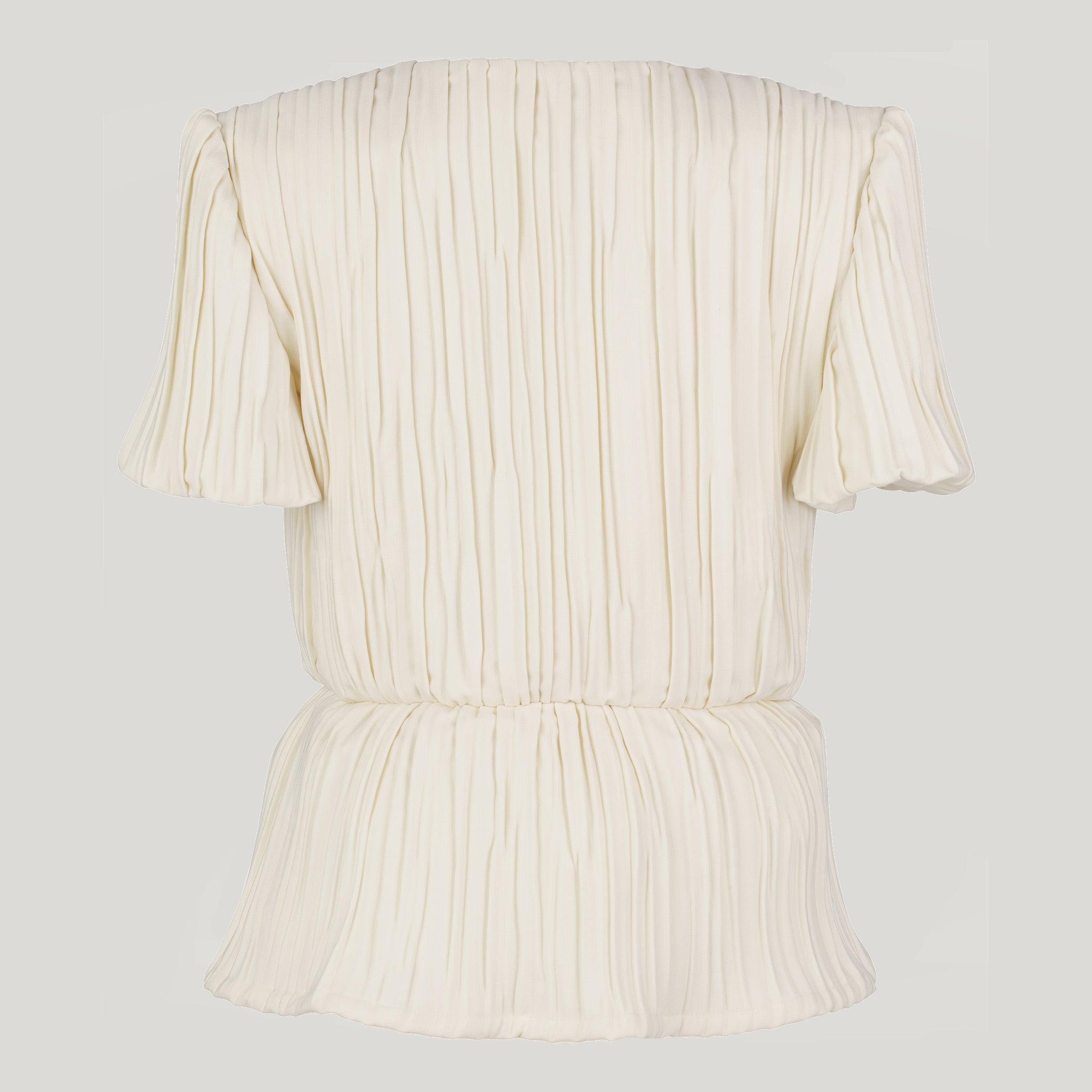 Our limited edition Casablanca Jacket is made in a loose peplum shape from ivory wool-barathea, double crepe in ecru, meticulously tailored almost entirely by hand, featuring a pleated silhouette with short sleeves.