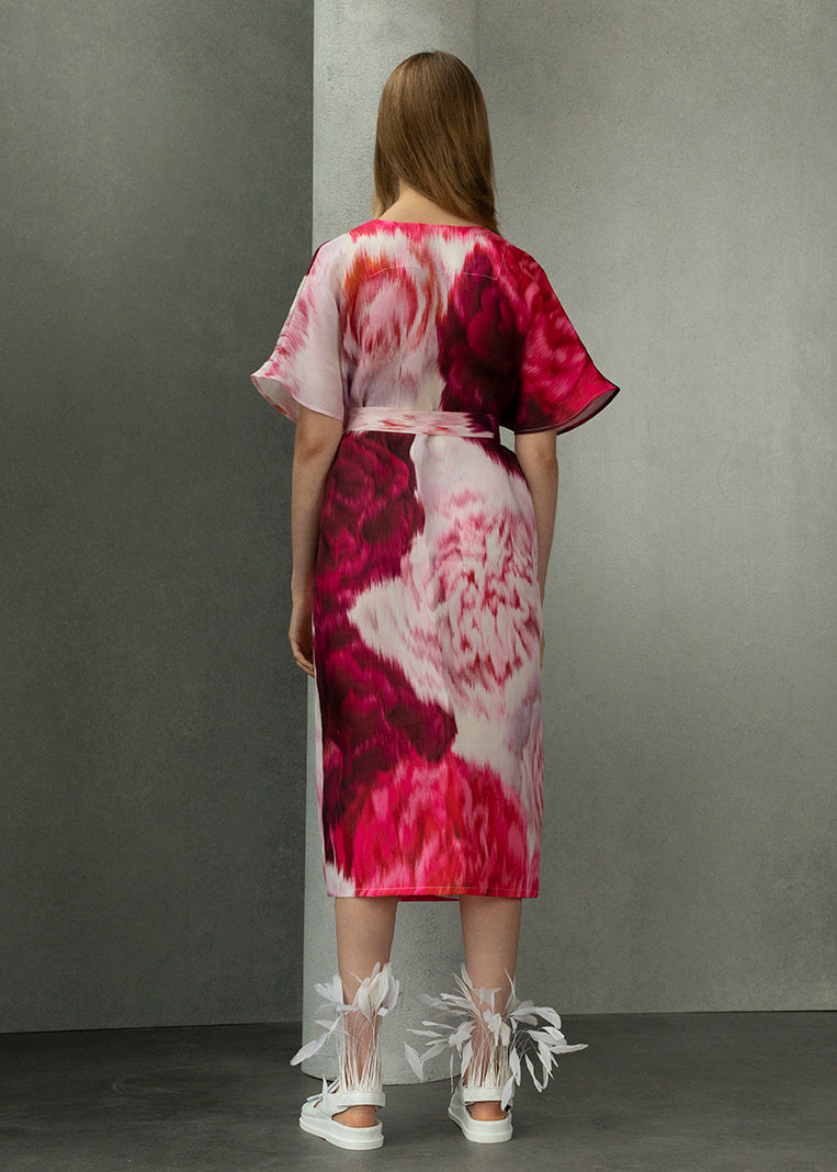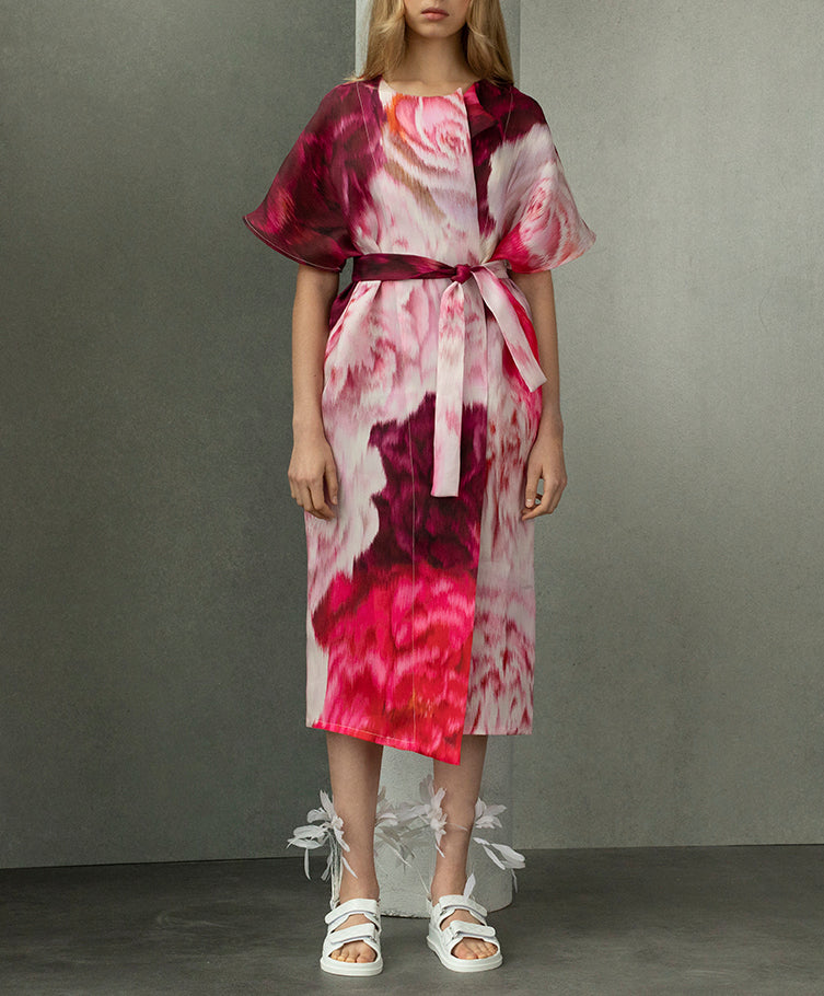 Our limited edition Georgia O. kimono is made in an oversized A line from burgundy and pink printed silk-gazar exquisitely sewn, featuring a floral motif, airy sleeves, practical pockets and a belt.