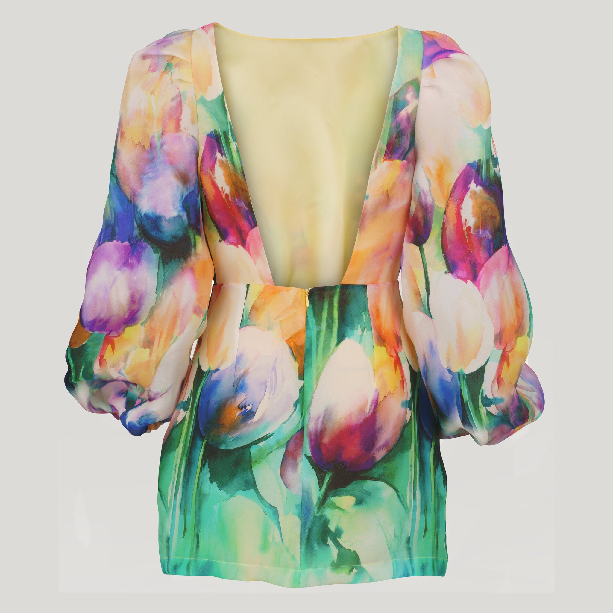 Our limited edition JO short dress is made in a loose straight column from printed silk-gazar exquisitely sewn, featuring an impressionist floral motif, voluminous long sleeves and a refined open back.