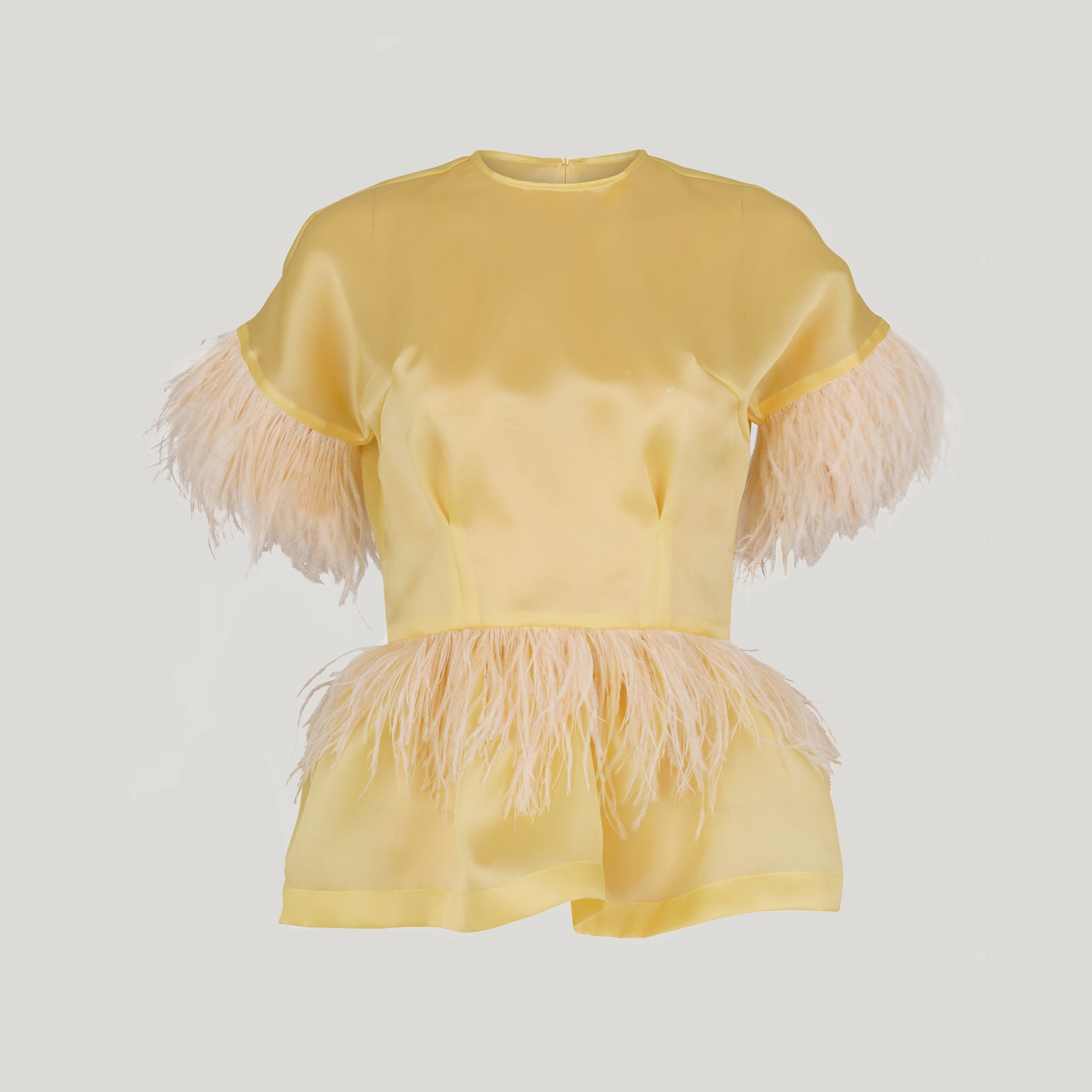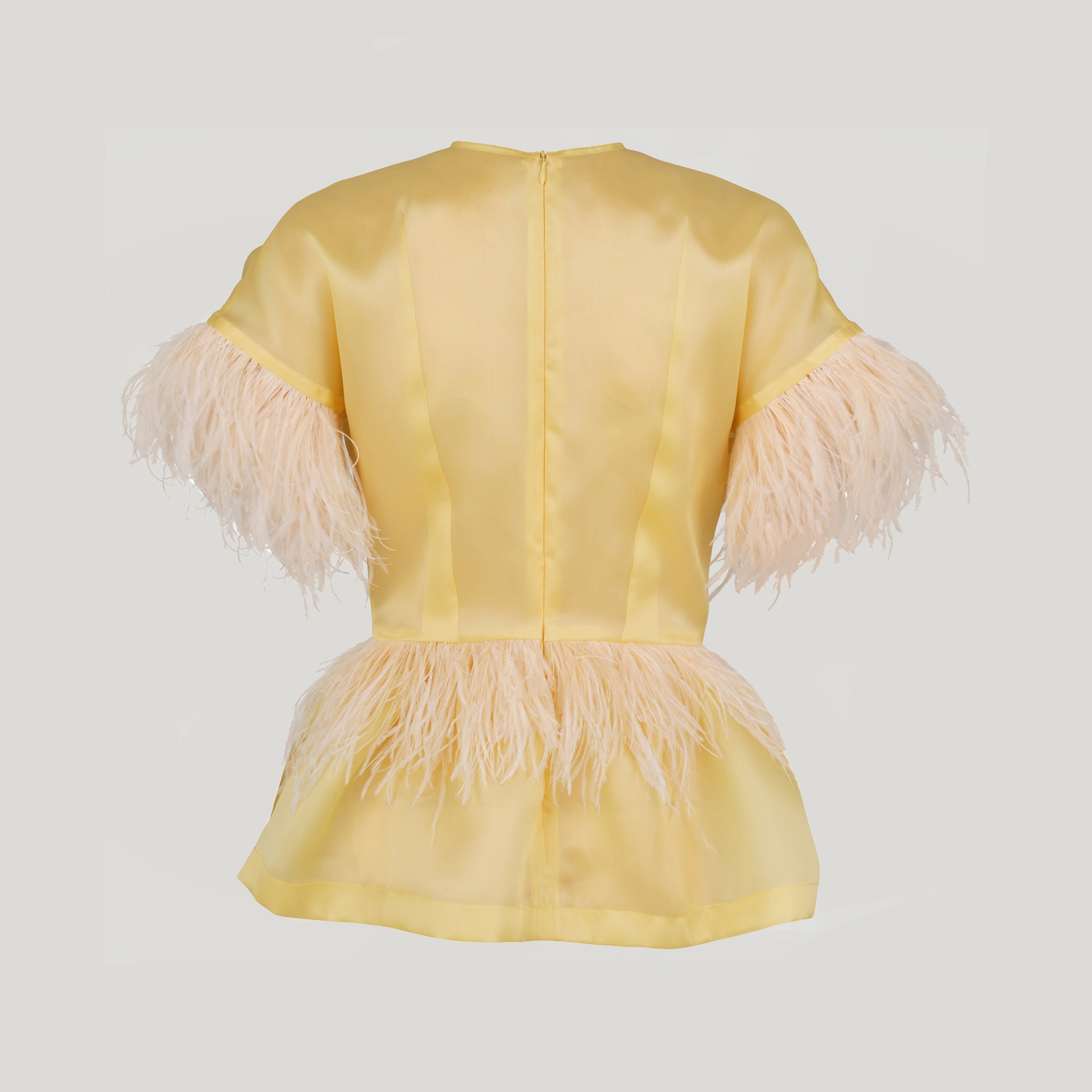 Our limited edition LSD peplum top is made from dusty yellow silk organza featuring a delicate fit, feathered sleeves and a feather-embellished waistline in soft coral hues.