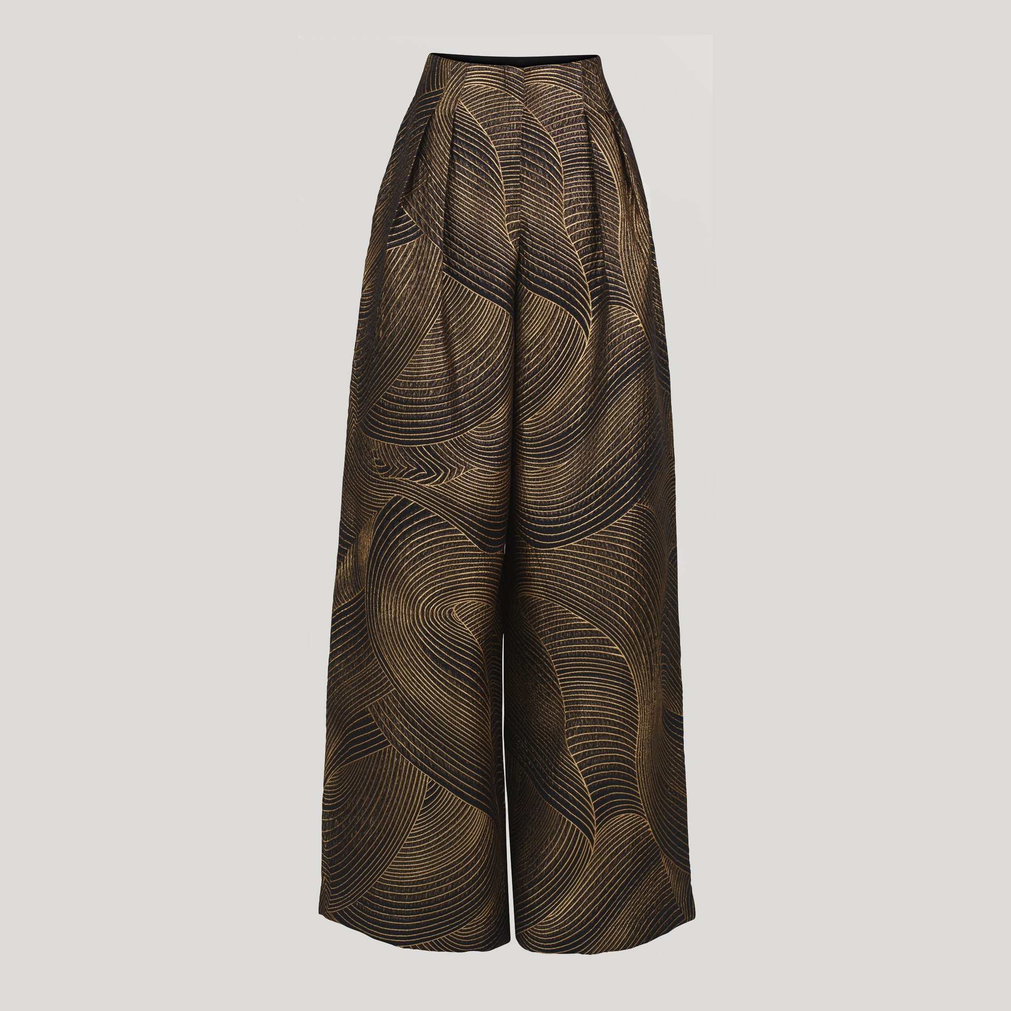 Our limited edition Peggy Palazzo Pants are made in an oversized A line from a gold and black silk blend in metallic cloque finely tailored, featuring a high waist, practical pockets and a mesmerizing swirl pattern.