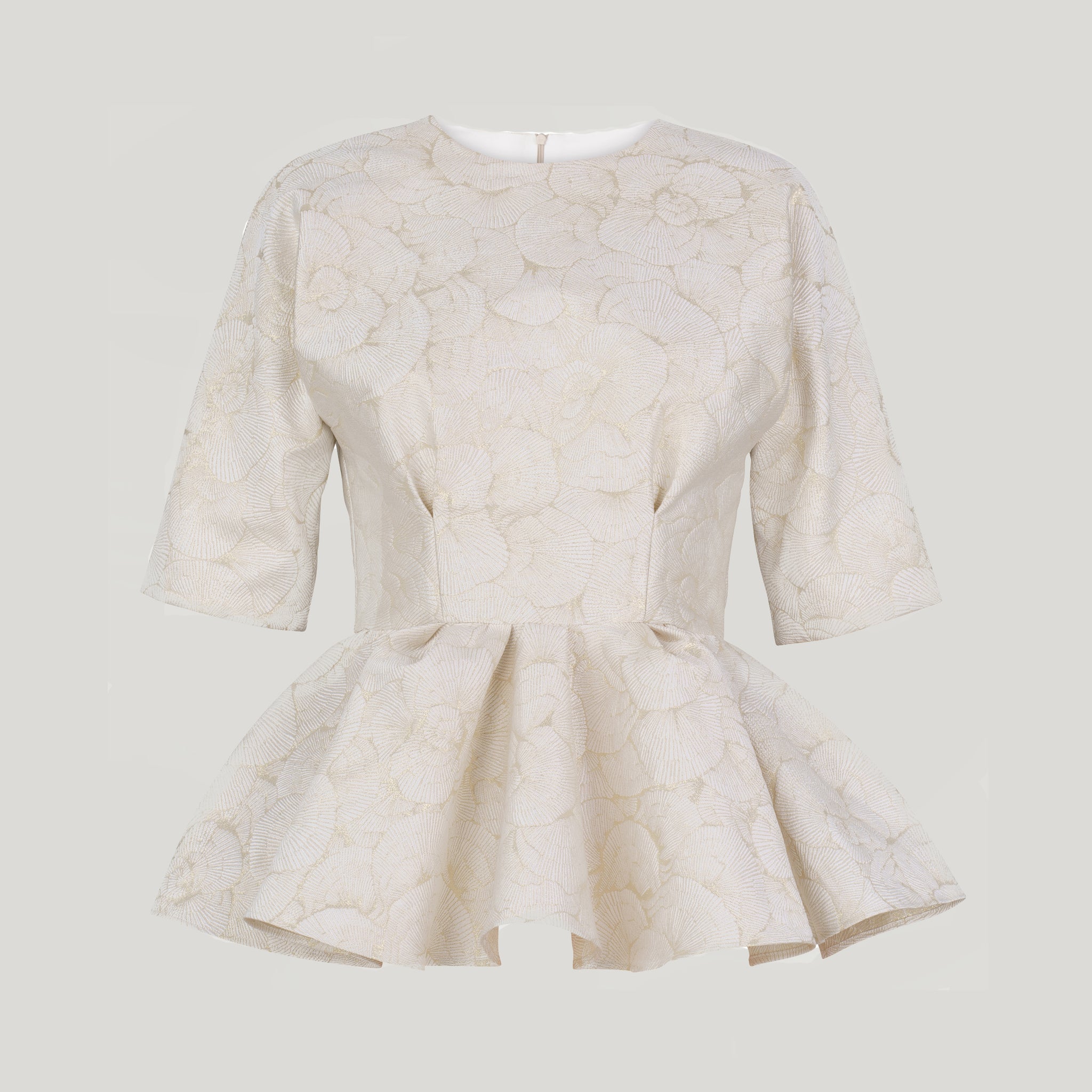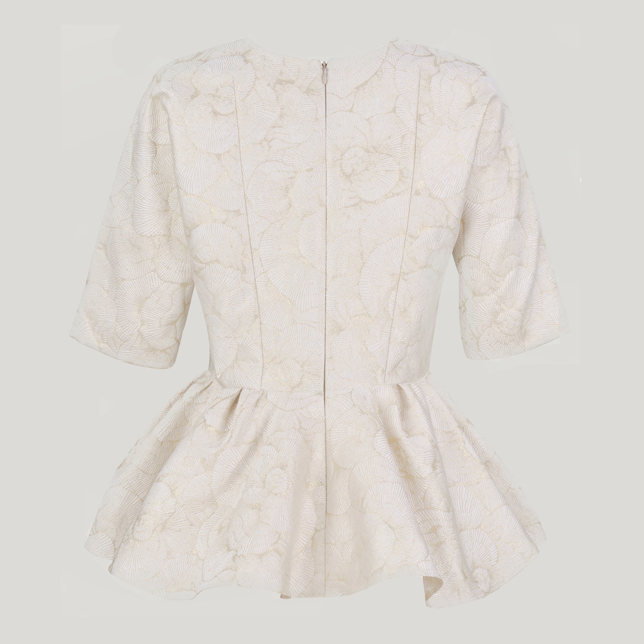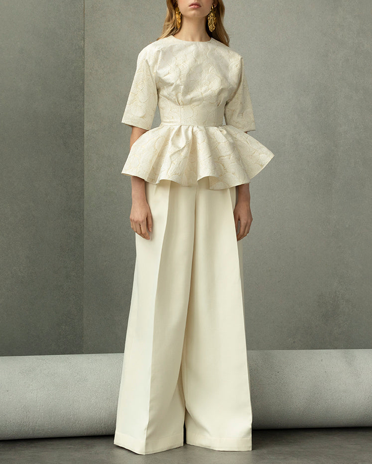Our limited edition Peggy ruffled peplum top is made from a white silk and polyester blend with metallic brocade exquisitely sewn, featuring sheer and graceful half sleeves.
